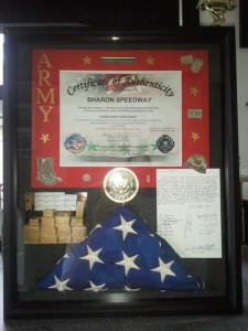 Cyndi Stiffler presented an American Flag to Sharon Speedway via Military Intelligence Battalion #373, which flew the flag at their base stationed in Iraq. On June 11, fans donated many personal items and supplies for our soldiers that are part of Operation New Dawn. These soldiers will be in remote areas for one year with very little personal items to help beat the heat and poor conditions.
