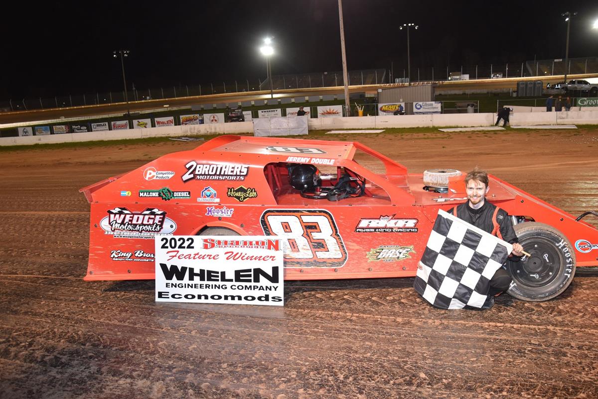 Ninth starting Jeremy Double survived a three-wide battle for the lead then snuck past Dennis Lunger, Jr. on lap 14 to win a caution-filled, time-shortened Whelen Econo Mod feature. Double's 17th career Econo Mod victory was worth $500 and came in his 2 Brothers Motorsports/King Bros./Wedge Motorsports/Russ King Racing/Malone Diesel/Bala Management/Honey Labs-sponsored #83.