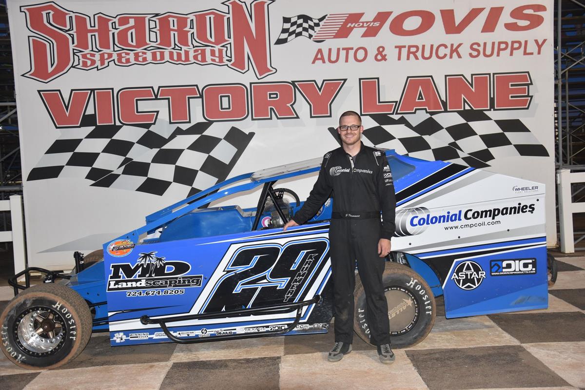 Krummert held off Thomas in the one-lap shootout taking the checkered flag first by 1.028 seconds in his Colonial Companies/MD Landscaping-sponsored #29 for his second overall win of the year at Sharon and 13th of his career. Wolbert was third. King came all the way back to claim fourth with Shingledecker advancing nine spots from his original starting spot to complete the top five.