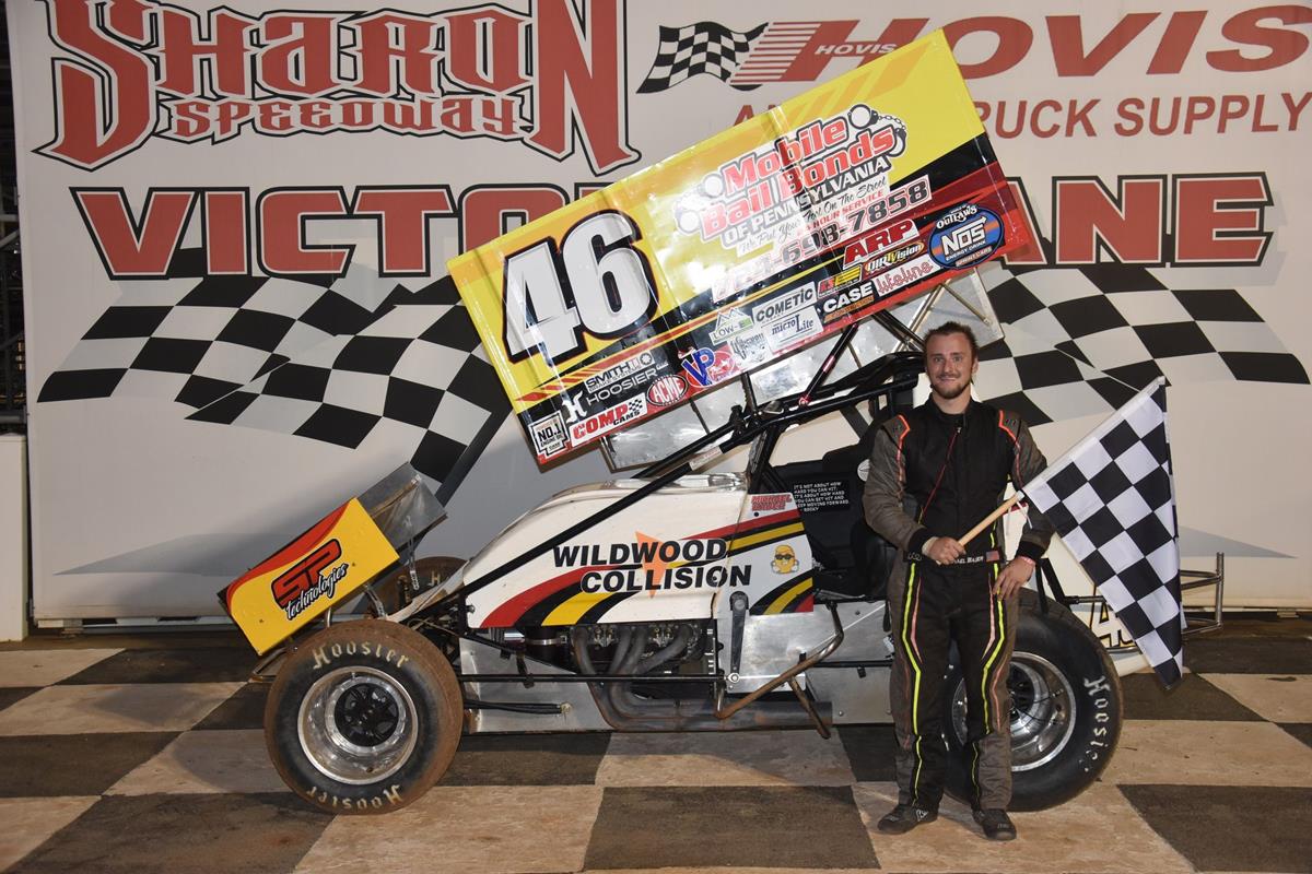 (Hartford, OH)…Despite three rounds of showers during the morning, afternoon, and evening, Sharon Speedway management persevered with the "Steel Valley Thunder" program for the "Bill Kirila Memorial" presented by Bucks Fabricating and Barris Supply on Saturday night. Four drivers celebrated their first wins in the Hovis Auto & Truck Supply victory lane including Michael Bauer-Hovis Auto & Truck Supply "410" Sprint Cars, Cody Koteles-Gibson Insurance Agency Pro Stocks, JC Boyer-HTMA/Precise Racing Products RUSH Sportsman Modifieds, and Jacob Eucker-Whelen Econo Mods. Eighty-three cars filled the pit area matching the season high from the "Lou Blaney Memorial"
